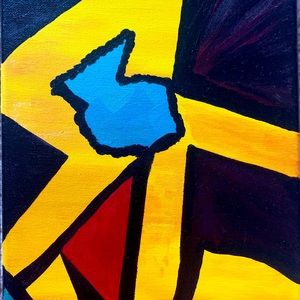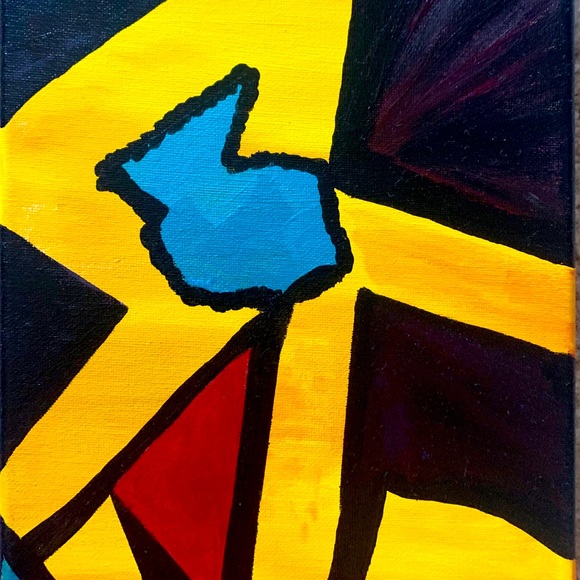 Beautiful abstract art hand painted in bright yellow emerald green red and black . The size is 8”x10” original art signed by artist.