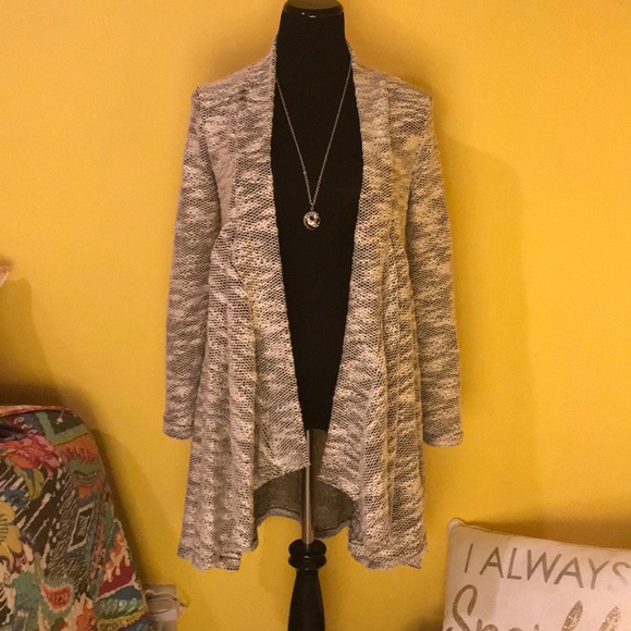 Black and white abstract drape front open cardigan.