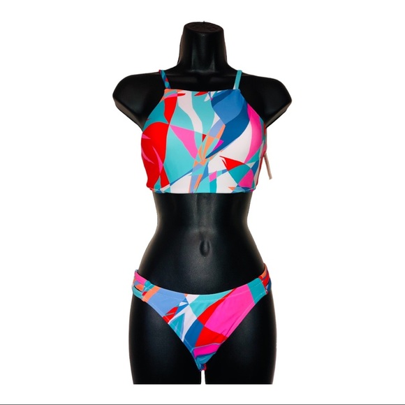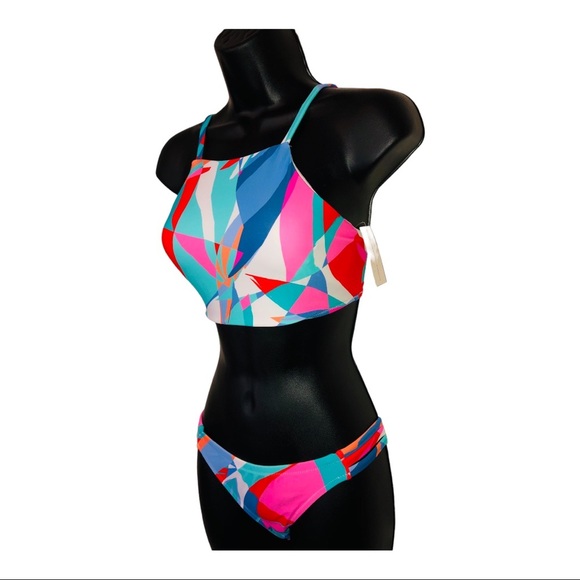 Abstract colorblock 2piece geometric print halter bikini set size XS new