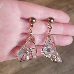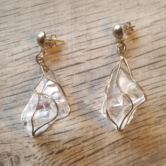 Abstract dangle earrings with clear crystal-like stone wrapped in metal wire. They measure ~2-1/4 inches long from top to bottom. I've never worn them so they are in excellent condition.