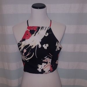 Exposed zipper closure in back. High neckline crop top. Red, cream and white abstract floral print on a black background.