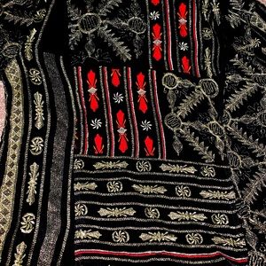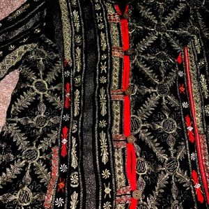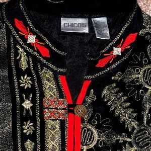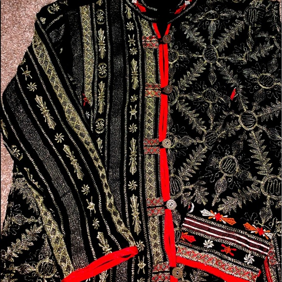 Wow ! One of my favorite pieces . As you can tell this is a black jacket with red and gold embroidery, which in fact has a glitter effect. The jacket is used but in amazing condition !