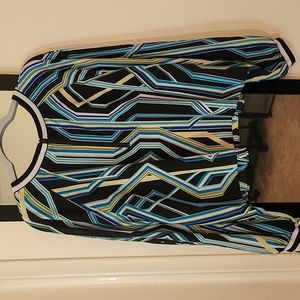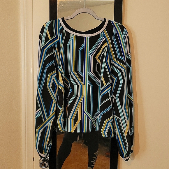 This blouse is suited with hues of blue, golds, grays, and white. Its versatile style cam be dressed cool, casual or for a night out.