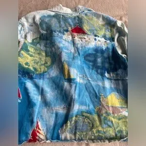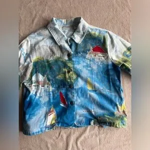 100% cotton jacket with an abstract múrele painted on it with rhinestones and pockets.