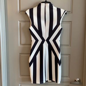 Black and white abstract print mini dress. Perfect for a birthday celebration or date night. Zippered closure in back. Mock neck