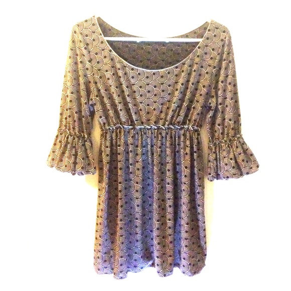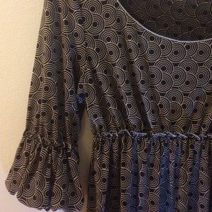 Great quality top with a very nice feel. Cute circle pattern in black and cream . Baby doll style with cute 3/4 sleeves.