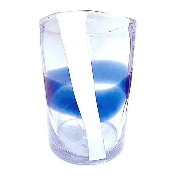 Beautiful large vase with vertical and horizontal blue and white lines.