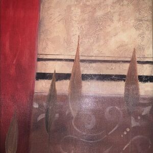 Brown, beige and red abstract leaf print wall art. Canvas. 24x24. Artist: Carol Robinson. Preowned in good condition.