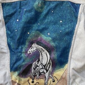 This is a vintage Jean brand jacket in size Large, made in Japan. It is a blue denim trucker-style jacket with a hand-painted horse theme. The material is 100% cotton with unlined interior. The jacket features studded accents and is ideal for women who appreciate unique, artistic designs.