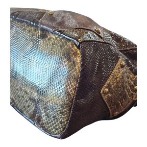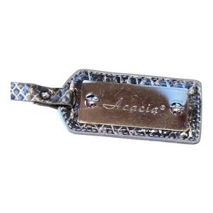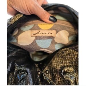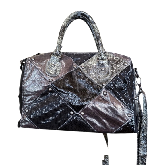 Acacia diamond stitch metallic black and pewter leather crossbody satchel. Top handles with zip closure. Silvertone hardware, reto polkadot fabric lining.