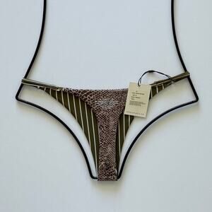 The Acacia Swimwear Ralphy Bikini Bottom in Hinahina is a minimalist yet striking piece featuring a deep olive green base with vertical cream pinstripes. This colorway exudes a clean, elevated aesthetic while maintaining a subtle edge.