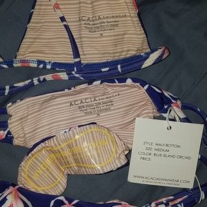 Rare acacia bikini set in blue island orchid print. Santorini bikini top size medium. Brand new with tag, plastic wrap & hygienic liner maui bikini bottom size medium. Selling only as a set. Not willing to sell either piece separately. Not looking to trade or negotiate due to posh fees