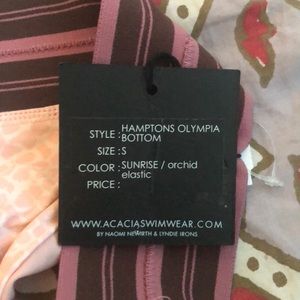 Acacia Hamptons Olympia bottom Size small in color sunrise/orchid elastic NWT some flaws loose stitching, doesn’t affect the wear on this bottom and a tiny spot on bottom of bikini looks like it will come out when wash. This is brand new so haven’t tried to wash out priced low due to flaws