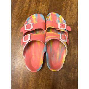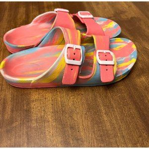Academy Girls' Tie-Dye Print Pink Slip-On Double Buckle Slides/Sandals/ Waterslide Shoes. Give her feet a comfortable feel and pop of color with these 2-buckle tie-dye print slide sandals. The 2-buckle closure allows a snug fit. 1-piece EVA uppers and outsoles cradle the feet. Size 3. Excellent used condition.