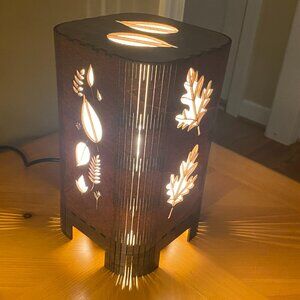 This Laser Cut Wood Accent Lamp is a beautiful and unique piece that will add a touch of warmth and elegance to any room. This handmade lamp is stained in dark walnut and features intricate leaf patterns that have been laser cut to create a stunning effect. The light peeks out from autumn leaf patterns, creating a soft and inviting glow that is perfect for creating a cozy atmosphere.