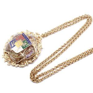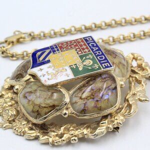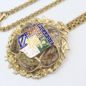 This captivating vintage necklace, crafted by Accesocraft in the 1970s, showcases an exquisite pendant that is sure to catch the eye. Made from intricately designed gold tone metal, the pendant features five glass stones, each creating a mesmerizing visual effect. Adding to its allure, the pendant also displays the Picardie Royal Coat of Arms of France with delicately applied enameling. Marked with "ACCESOCRAFT," this necklace is in excellent condition, radiating a timeless beauty. The chain measures 30" in length, while the pendant itself has a diameter of 2 1/2".