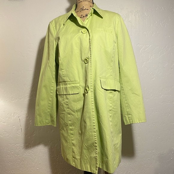 Access (Liz Claiborne) all weather jacket. Light green, button down, with functional pockets. No size tag but Bust-armpit to armpit around 43 inches, shoulder to shoulder 17 inches, length 35 1/2 inches.