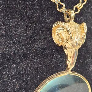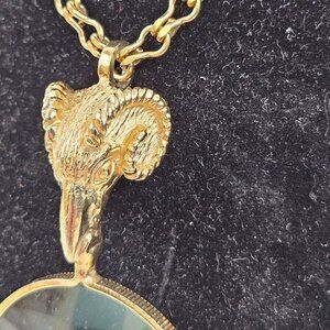 Accessocraft NYC Ram Head Magnifying Glass Pendant Necklace Gold Tone Vintage