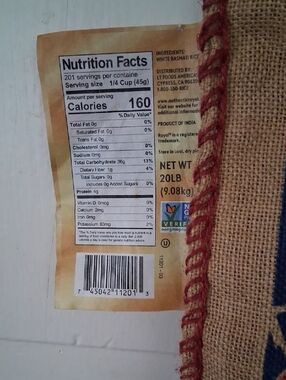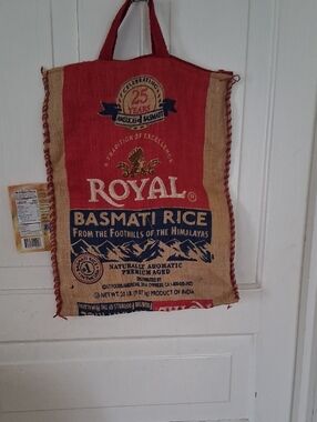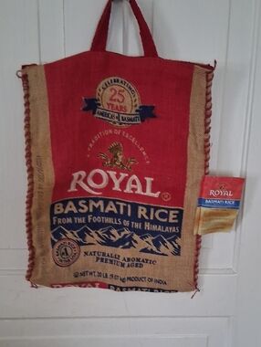 Royal Basmati Rice Repurposed burlap tote bag .Himalayan Graphics. Size 18"×14" 13"zipper opening. Many repurpose options