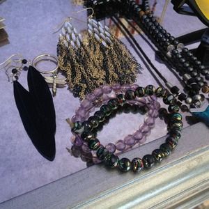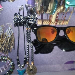 Great deal! A bundle of 9 cute accessories!!! 2 pairs of earrings, 1 ring, 2 beaded bracelets, 2 necklaces, 1 floral bow made by me, and a pair if sunglasses! If you want to buy any of these separately comment below!