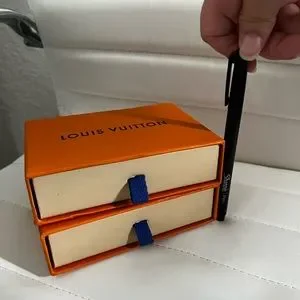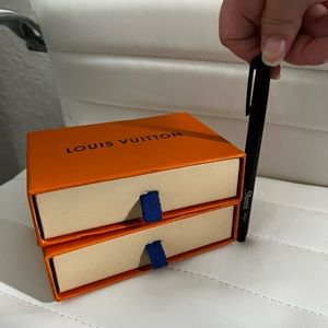 Comes with 2 LV luxury accessory boxes. Boxes are super cute, slide to open with blue tabs and soft dust cloth for storage inside. Auth: N/A. Used a pen for reference on scale.