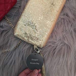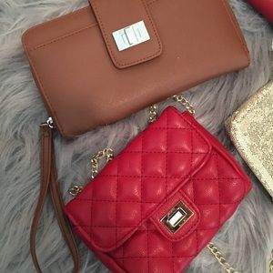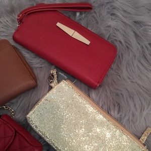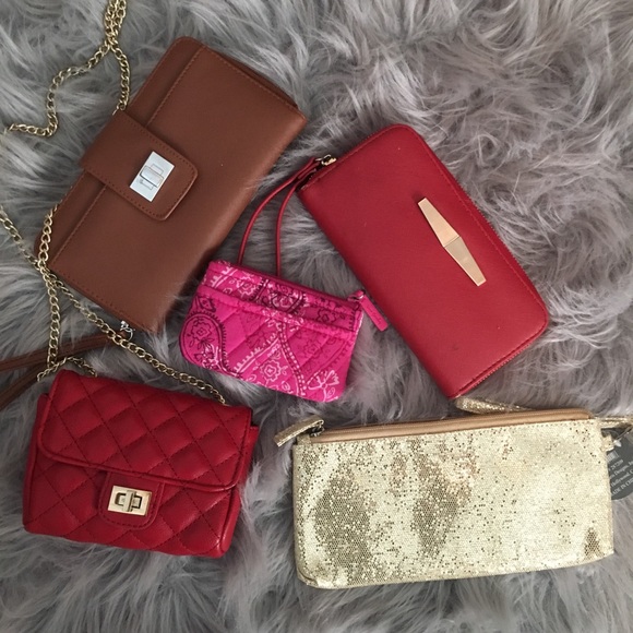 5 gently used items for the price of one! The gold wristlet bag is still brand new with tags as shown. The Red wallet his minor markings which can be found in the pictures, all of the other items are free of holes and tears. Both wallets have standard insides for cards and cash. The pink change purse is Vera Bradley and has never been used.