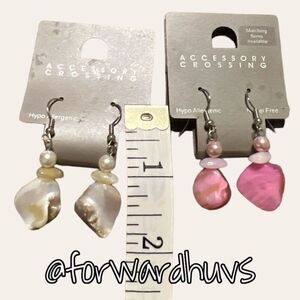 One set showcases charming pink mother of pearl earrings, while the other features elegant white mother of pearl designs. Both pairs exude timeless sophistication and versatility, ideal for various occasions.