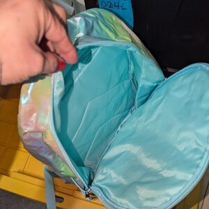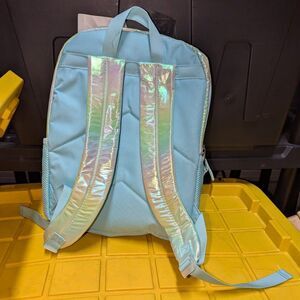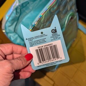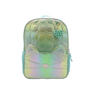 This Accessory Innovations backpack is perfect for back to school and beyond. It's made of iridescent poly nylon and features 3D ears, quilting, an iridescent PU nose with embroidered whiskers, and a detachable pop heart key ring.