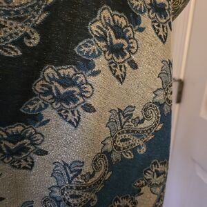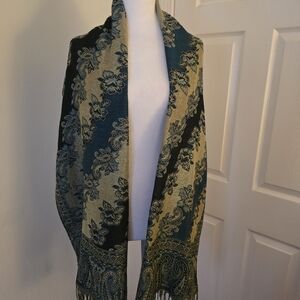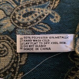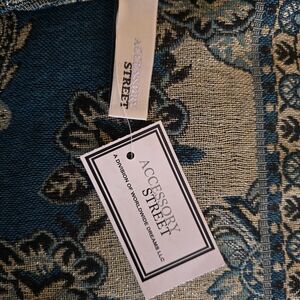 The accessory Street aqua, metallic gold, dark blue long scarf is a stylish and versatile accessory for women. made from 90% polyester and 10% metallic material, this scarf features a beautiful aqua and metallic gold color combination. it can be worn with various ways such as a neck warmer or head scarf, making a perfect for the winter, fall, in spring seasons. hand wash only to maintain its quality, the scarf is a fashionable and practical addition to any wardrobe. made in china, this scarf is a must have for those looking to at a touch of Shimmer to their outfit. the scarf retails for $40.