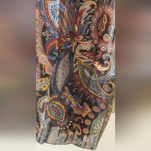 Elegant scarf with a paisley pattern. Features rich colors for a stylish look.