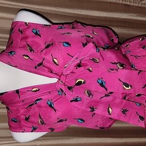 Fucia pink fabric with birds on it, so cute. Elastic waist. Chest measures 18 inches across. Says size Large, but I think it is a junior size large. Made by Accidentally in Love.