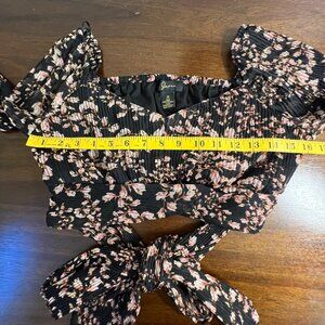 The bow wraps around to tie in the back. The fabric is pleated throughout the entire top. Sheer overlay, the sleeves are all sheer. Size small. No flaws.