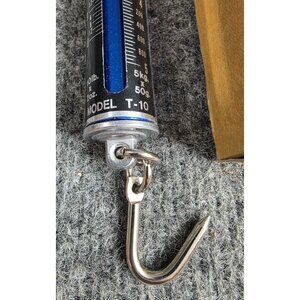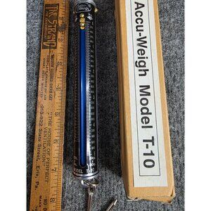 This Accu-Weigh Model T-10 scale is a compact and durable hanging scale with a 10lb/5kg capacity. Featuring easy-to-read markings in both pounds and kilograms, it's perfect for precise measurement. Its chrome hook and top loop ensure secure use, and the scale comes in original packaging for added convenience.