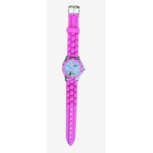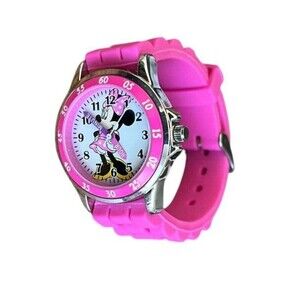 The Accutime Disney Minnie Mouse Kid's Wristwatch features a pink silicone strap and a stationary bezel with a Minnie Mouse theme. The watch has a metal case with a glass dial window, displaying an analog dial with a white color. It operates on Quartz movement and includes a second hand feature. This children's wristwatch is designed with a 33mm case diameter, 6mm case thickness, and a 15mm band width. It is powered by 1 CR123A battery and comes with a warranty from Watch Corp. Perfect for young Minnie Mouse fans, this timepiece is both functional and stylish.