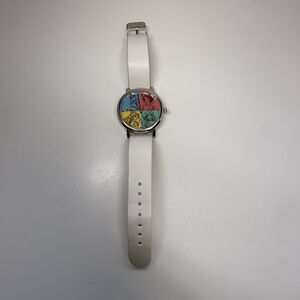 Disney princesses watch featuring Snow White, Ariel, Belle and Cinderella. Each princess is in a different color block and their image is really cool in what looks to be a freehand drown print. Comes on a faux white leather band. This watch is brand new in original box But when changing battery, back edge got scratched up this flaw is shown in last picture but cannot be seen when wearing watch. Comes from a smoke free home.