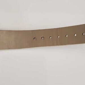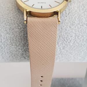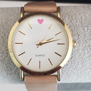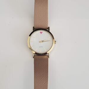 Accutime women's watch has a white dial with a heart at 12:00. Case is gold tone and the band is brown faux leather. Very good Condition.