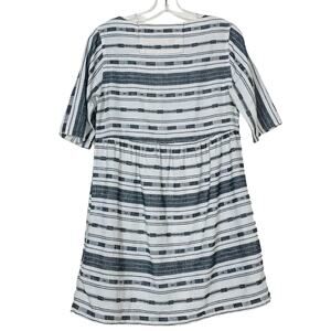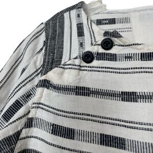 Classic Ace & Jig mini dress made with cotton and linen, substantial construction and thickness yet so soft and casual. Woven black and white stripe pattern with two black buttons on either side of the bateau neckline. Has small pockets at hip. Labeled size Small, check measurements! In good used condition, there is a small threadbare spot at the right waist, see picture.
