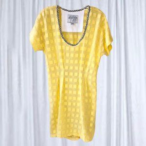 Ace & Jig yellow pullover scoop neck short sleeve dress. Dress has overall pattern and raised tuff balls. Black and white trim around the neckline. Pretty shirring in the back.