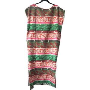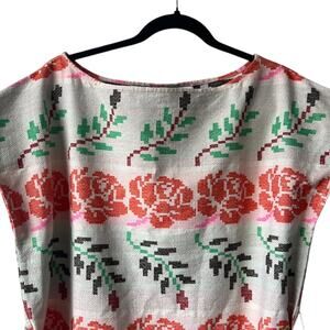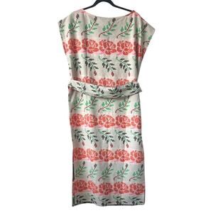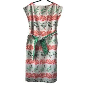 A reversible sleeveless midi length shift dress with a removable fabric belt. Made in our namesake textile, a luxe midweight structured natural singlecloth featuring woven floral motifs in poppy red, neon pink, and bright green.