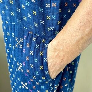This one piece jumpsuit romper jumper from Ace & Jig in navy blue features dot / stripe rainbow geometric woven detailing in shades of purple, yellow, orange, green, gray, white, and blue with a tank bodice, tie detail at the neckline that can adjust the spaghetti shoulder straps, side pockets, a slightly dropped crotch, and an ankle-length leg.