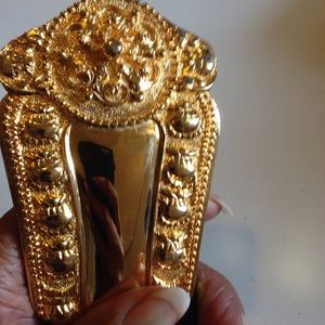 Black leather. Accent gold tone buckle with pin wheel design. Mink r edging wear. Very stylish