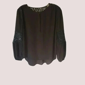 Achioowa top with lace insets at back yoke sleeve round neckline concealed half-placket button front relaxed silhoutte pullover style 100% viscose in excellent condition from smoke and pet free home