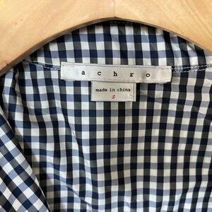 This cute women’s top by the minimalist brand ACHRO is size small. It’s a navy gingham collard crop top and would pair so well with jeans or skirts ✨ The material is the most unique aspect!—it reminds me of a rain coat material (water repellent feel). The top has cute buttons along the back :)