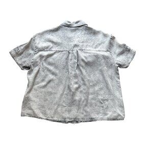 Soft, lived-in denim short sleeve shirt with an acid-wash finish. Relaxed, slightly oversized fit with a full button front and two large chest pockets. Easy to style open over a tank, tucked into jeans, or worn on its own for a casual, effortless look.