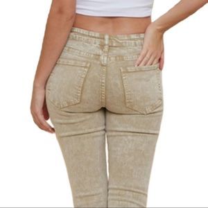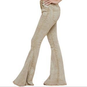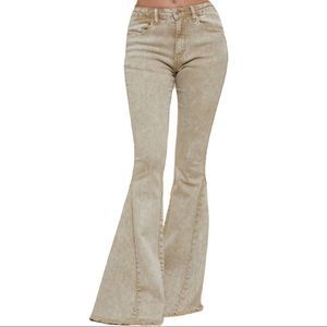 Acid Washed Khaki Color Bell Bottom Jeans. Frayed Hem.