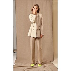 * Cut from a linen blend suiting, Acler juxtaposes two distinct blazers in this double-breasted style.