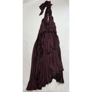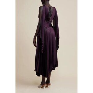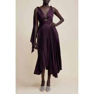 Description from retailer: A showcase of thoughtful design elements, the Columbus Midi Dress in Blackberry is a mindfully made piece. Plunging neckline, subtle front bodice cut out, asymmetrical hemline and elegant draping fabrication from the shoulder. Perfect for your events this season ~ pair with a simple heel for a complete look.