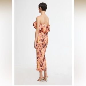 Stunning midi dress from designer Acler. Multicolored abstract print. Strapless with large ruffle detail on top. Great quality and condition
