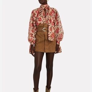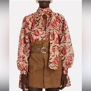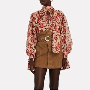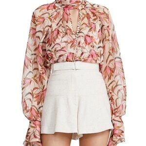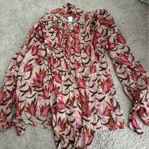 Beautiful blouse from Acler. Blends of beautiful browns and pink floral print. Sheet with lots of buttons down center front and long neck tie. Great quality and condition but size tag has been removed. Would say best for a size M but happy to send measurements