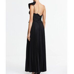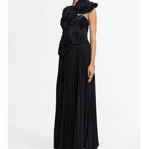 Elegant black maxi dress. Features intricate floral detailing. One-shoulder design. Perfect for formal occasions.